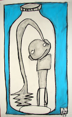 Back in April of 2008, Abby drew 50 drawings of bottles at her studio in Brooklyn, the outline of each drawing was made while listening to the Joan Jet cover of the theme song from the Mary Tyler Moore Show: “Love is All Around” played once through. The drawings were offered for sale online as a fundraiser for her trip to Mexico for the Performagia 2008 festival. She sold enough drawings to cover her ticket.